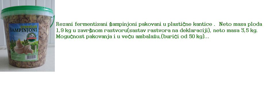 ISPORUČUJU SE KAO: Sveži šampinjoni 200 gr., sveži šampinjoni 400 gr., sveži šampinjoni rinfuza i marinirani šampinjoni. Dalje »